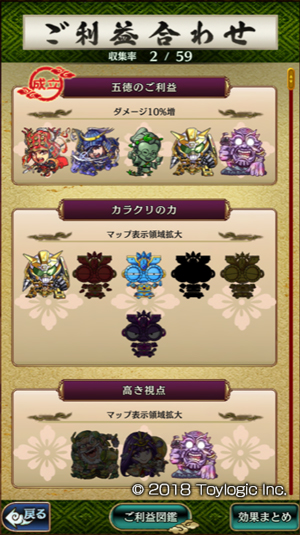 また、「ご利益合わせ」にはマップ表示領域拡大やダメージ増、被ダメージ減など有益な効果がたくさんあります。